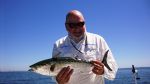 Meanwhile the shipping channel is absolutely loaded with Bonita and Mackerel. At times my anglers actually take a break from catching Bonita 8-12 pounds as their wrists get tired!There are no secrets here just look for the birds diving on what’s left of the glass minnows. Bonita are gorging on glass minnows and will frequently spit them out all over the boat... Bonita are shyer than Mackerel and often will dive deep when you approach, set yourself up current and drift into the action. Often they will pop up right alongside or near the boat. I prefer Clark silver spoons retrieved rapidly, if you get your lure into the boiling frenzy it’s almost a guaranteed hookup. Do not slow your retrieve; trust me you cannot retrieve the lure to fast. From up in my tower I get a bird’s eye view of the speedsters attacking.