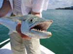 Stop number one was in 6-8’ on a grass flat adjacent to Port Manatee. A quick check on the water temperature showing a blistering 87 degrees! I deployed a chum bag and tossed free lined white baits on 1/0 hooks into the outgoing tide. The action started quickly and didn’t stop! Spotted sea trout, mackerel, ladyfish and black tip sharks on almost every cast.