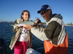 Sundays action started in 4-6’ of 65 degree water chasing trout. DOA CAL 3” paddle tail jerk baits root beer with chartreuse tail did the trick. Spotted sea trout 13-15” were non stop for an hour. Bounce the jig off the bottom, trout will hit the jig as it fails.