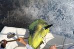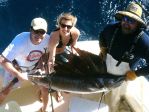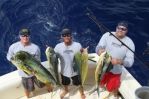All day long the fish were coming in one at a time. Sailfish numbers 5 and 6 were a double-header grabbed by Pauly and Leo. With the tally at 6 sailfish, 4 mahi-mahi, 3 bonita, and a blackfin tuna we decided to call it a day and headed home. On the trip back we told the camera crew that we would stop on a ship wreck and try for some amberjacks and barracudas. The current was at 3 knots here and the fish weren't biting off the wreck. I spotted an edge and moved the boat over to 150 feet and told the guys to put the kites up for a few minutes. Even as the kites go up with 3 baits on each Pauly hooks up on sailfish #7 while Darrin just misses getting another. I slide the boat over to 140 feet and as I do Darrin gets a bite off our right long rigger and hooks up on our last sailfish of the day, number 8. The crew from Outdoor Channel went 8 for 10 on sails and caught a handful of other fish- what a fantastic day of fishing.